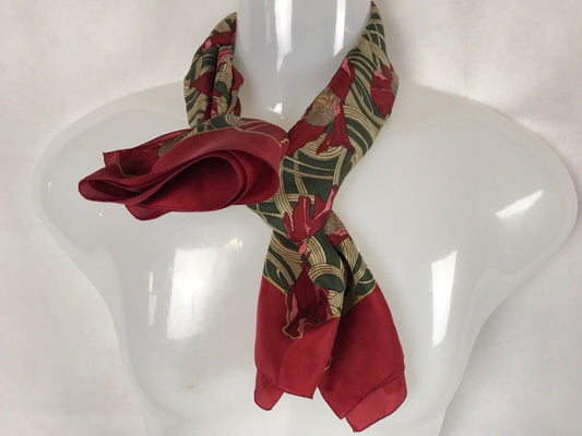 Boutique Square Silk Scarf/Bandana Red and Green Poppy Flower Pattern Red Border [New with tags]