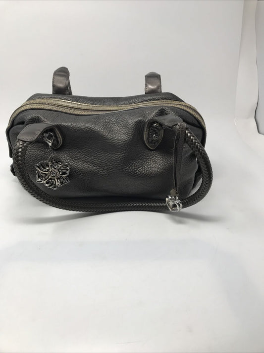 Brighton Pebbled Leather Shoulder Bag Pewter Braided Straps Zip Silver Flower [Pre-owned]